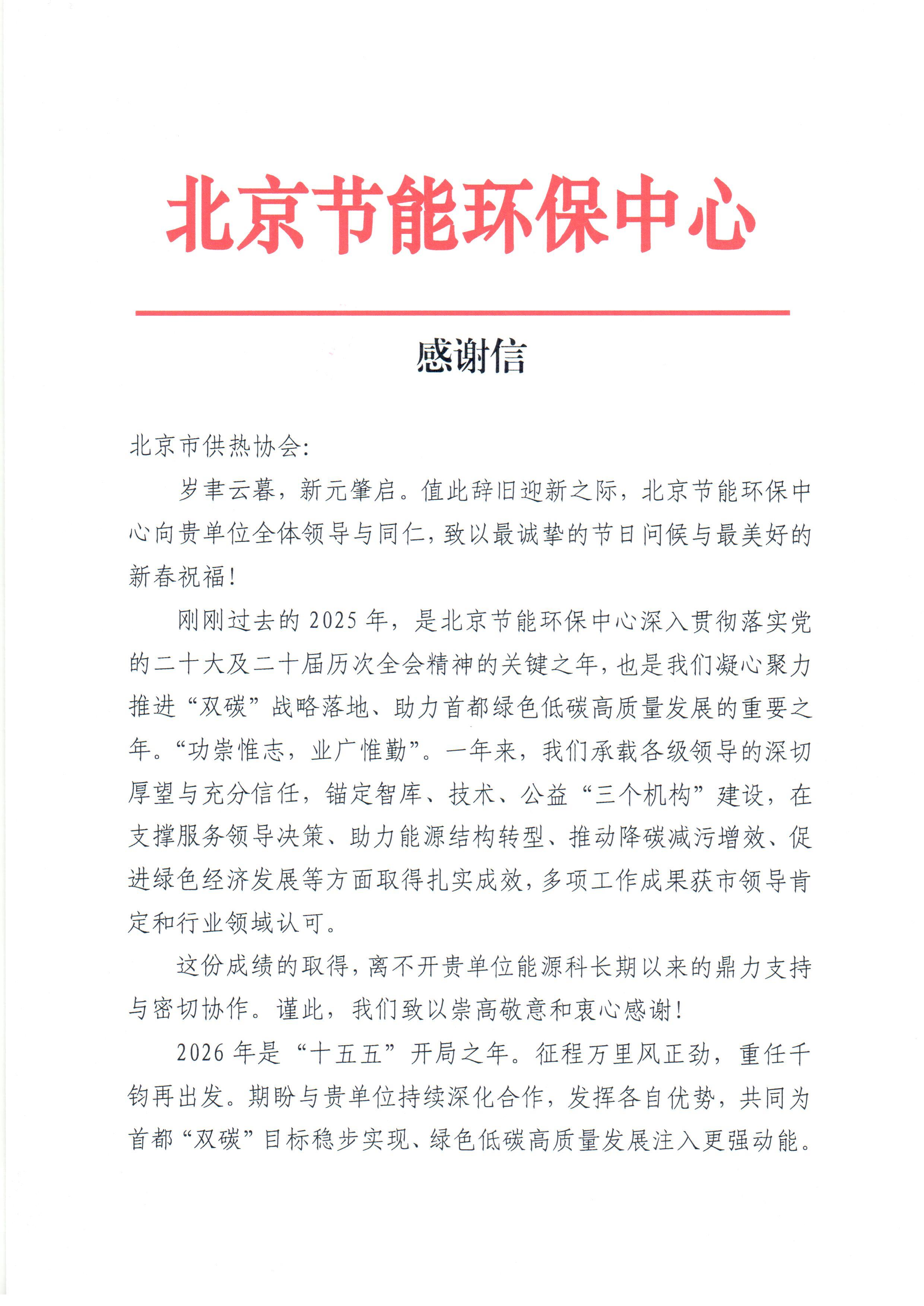 恰逢北京市供热协会第四届第五次常务理事会顺利召开之际,协会收到了来自北京市节能环保中心的感谢信。这份满载认可的信函,既是对协会2025年工作的高度肯定,更是对双方携手推进首都供热行业绿色转型的有力见证。