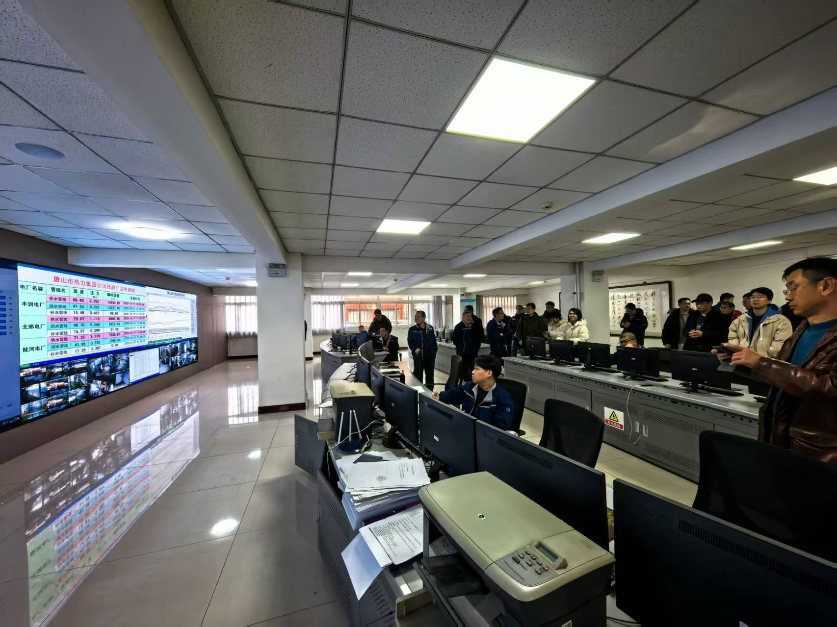 随后,考察团先后前往唐山热力调度中心与应急抢修基地进行实地参观。在调度中心,通过智能化监控系统,考察团直观查看了供热系统整体运行状态,现场摄像头、水浸传感器等设备实时反馈换热站安全情况,全方位的智能监测体系让大家对“科技保安全”有了更直观的认识。