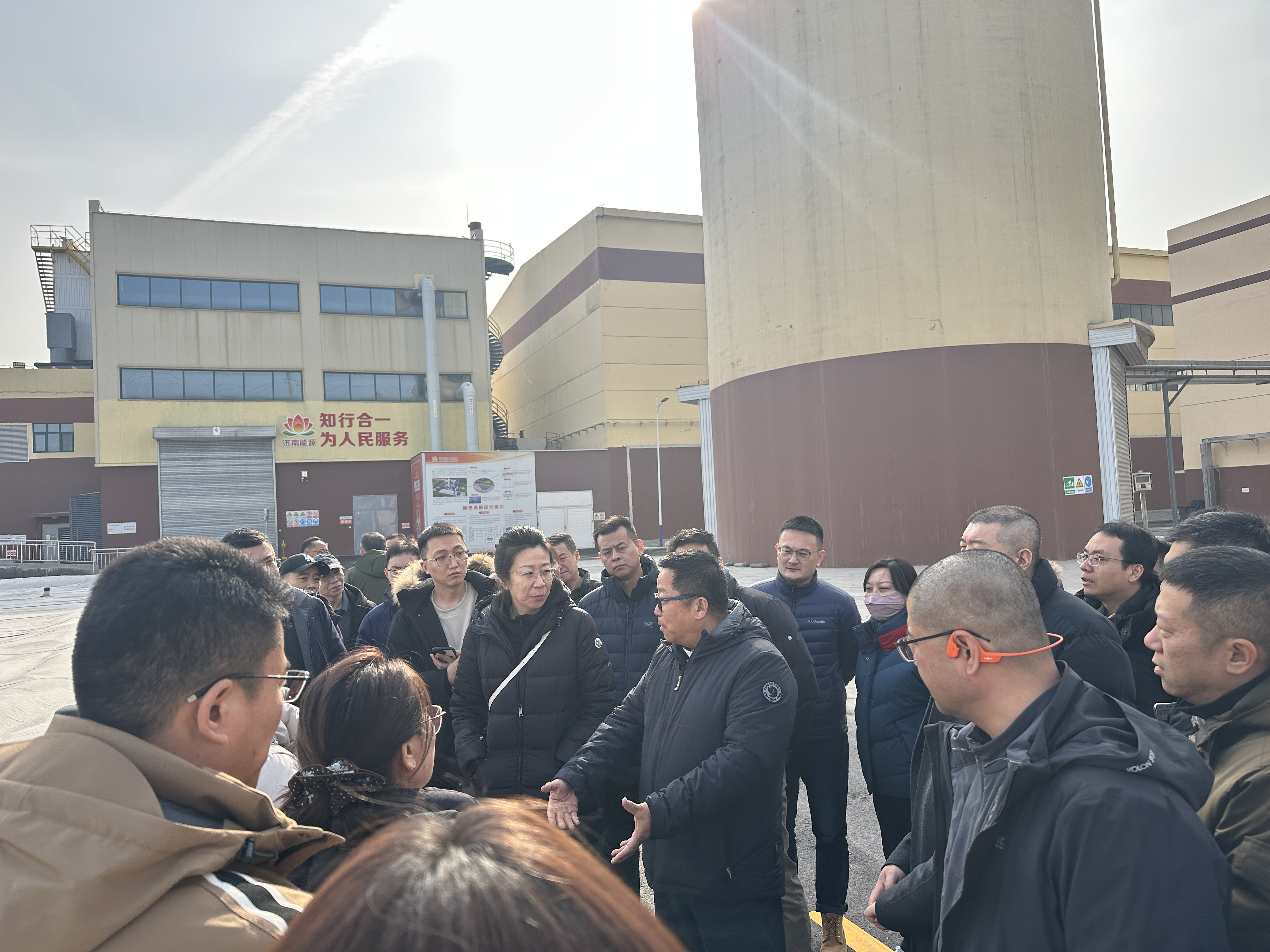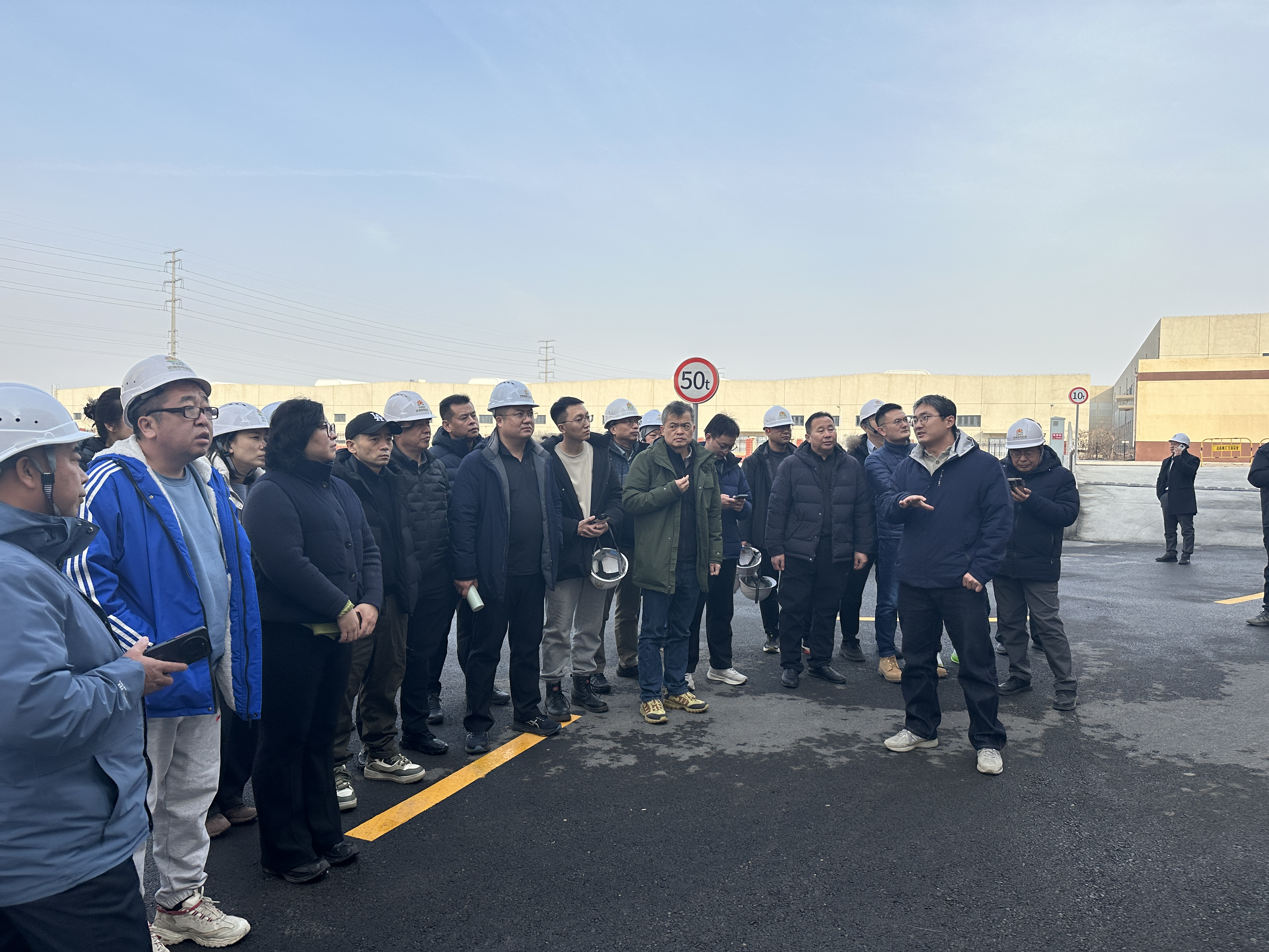 1月27日下午,交流团率先抵达济南能源集团旗下唐冶电厂,重点调研清华大学付林教授团队主导的大规模跨季节储热水库示范项目。该项目占地约9600m²,采用燃气、电力混合驱动,可实现89MW应急供热能力,正常供暖出力37MW,供热量4.8万GJ。交流团在储热水库顶盖上实地感受了新型保温材料的效果,详细询问了运行情况。